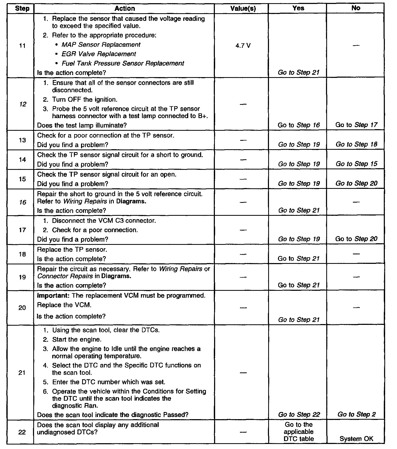 8. The 5 volt reference of the VCM supply is shared by the MAP, FTP, TP, and EGR position sensors. A short to ground at any of the sensors' 5 volt reference circuits, or an internally shorted sensor may cause this DTC to set. In order to determine the location of a shorted 5 volt reference supply, disconnect the sensors one at a time beginning with the MAP sensor.