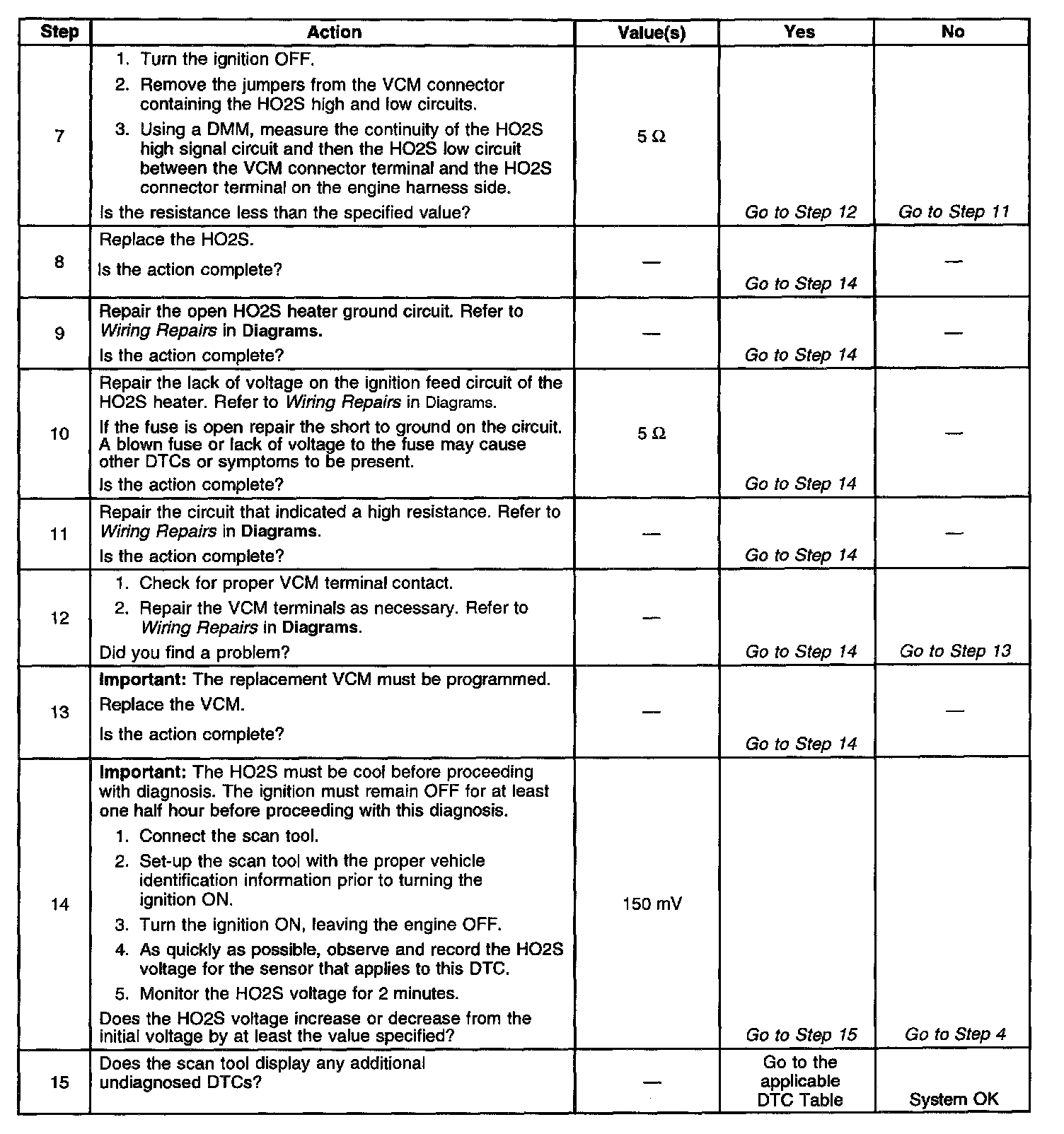 This DTC determines if the post-convertor HO2S heater circuit is functioning properly by monitoring the amount of time required for the HO2S to reach operating temperature. This DTC sets when the VCM fails to detect HO2S voltage transitions above and below the bias range within a specified amount of time. Possible cause of this DTC are listed below: