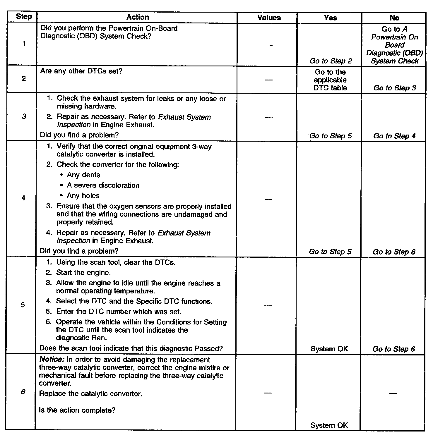 3. This table checks for conditions that can cause the three-way catalytic converter efficiency to appear degraded. Inspect and repair exhaust system as necessary.