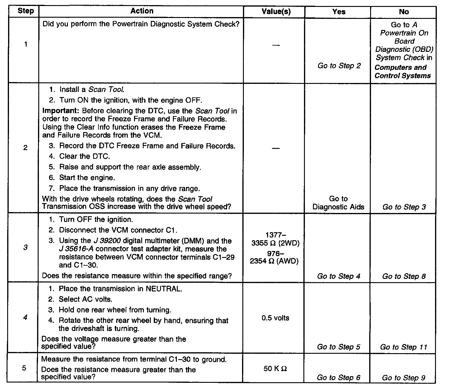 The numbers below refer to the step numbers on the diagnostic table.