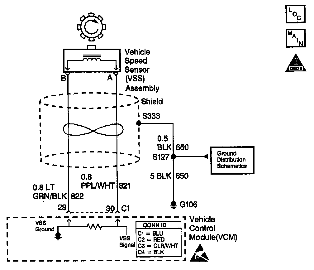 The Vehicle Speed Sensor (VSS) assembly provides vehicle speed information to the Vehicle Control Module (VCM). The VSS assembly is a Permanent Magnet (PM) generator. The PM generator produces a pulsing AC voltage as rotor teeth on the transmission output shaft pass through the sensor's magnetic field. The AC voltage level and the number of pulses increase as the speed of the vehicle increases. The VCM converts the pulsing voltage to vehicle speed. The VCM uses the vehicle speed signal to determine shift timing and Torque Converter Clutch (TCC) scheduling.