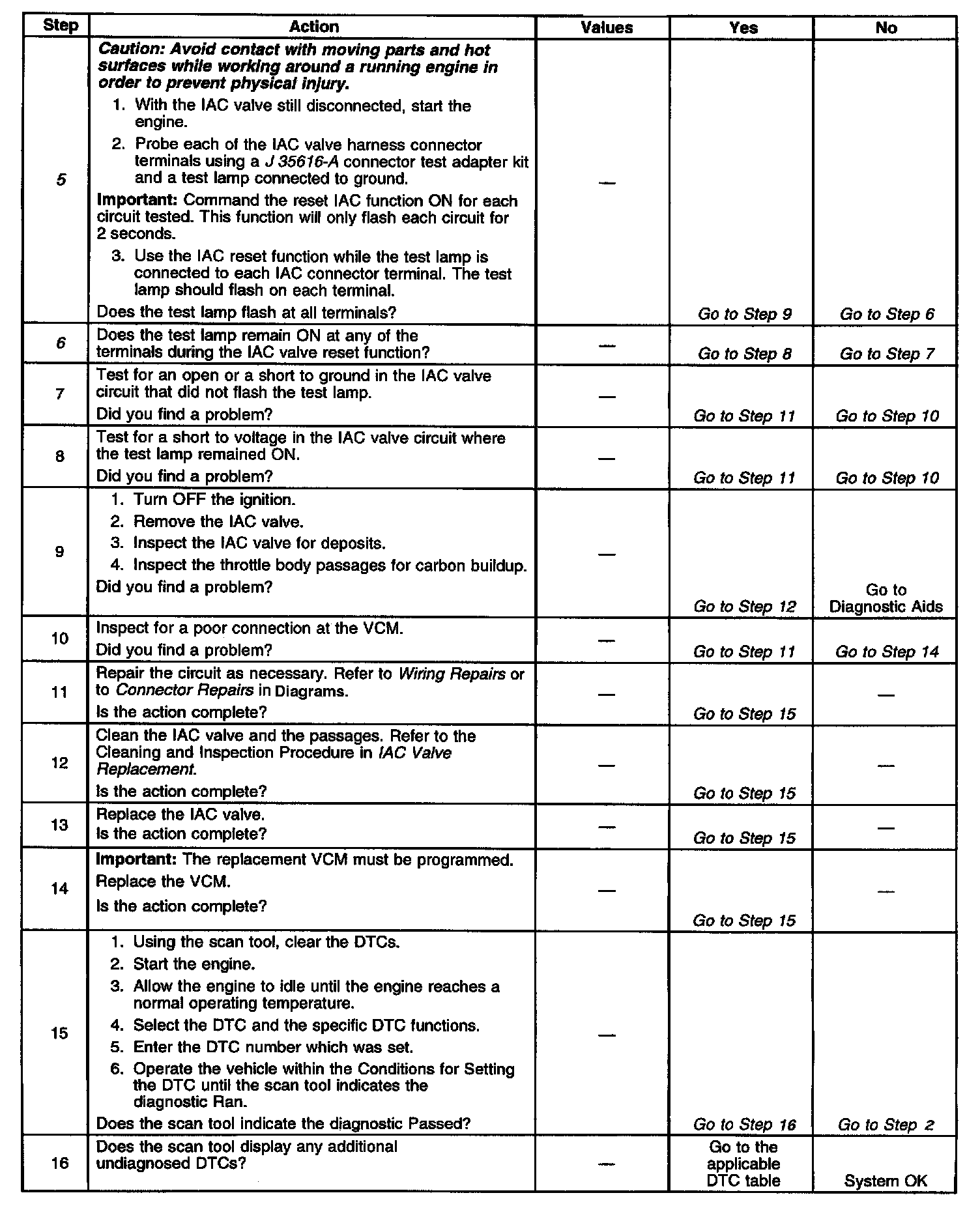 6. If the test lamp remained ON at any of the IAC valve harness connector terminals during the IAC valve reset function the circuit is shorted to voltage. If these circuits are checked before or after the IAC valve reset function it is possible that any combination of IAC circuits could illuminate a test lamp, this would be a normal condition.