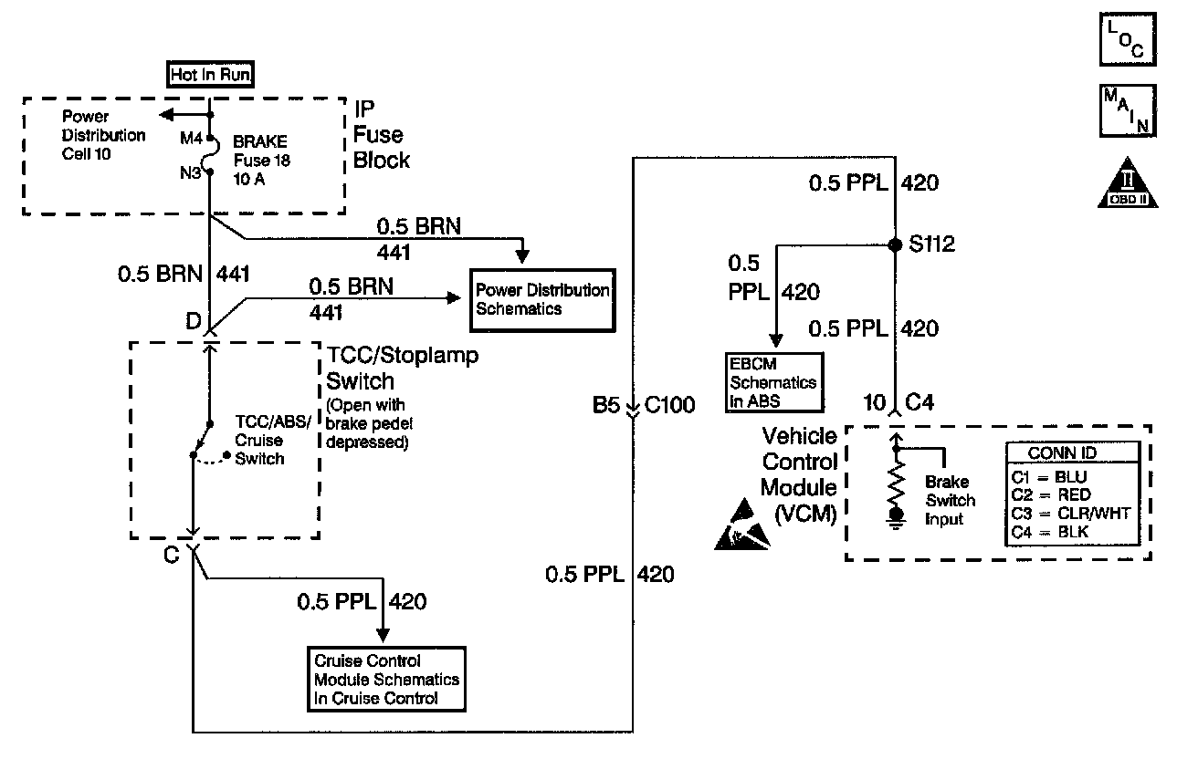 The brake switch indicates brake pedal status to the Vehicle Control Module (VCM). The brake switch is a normally-closed switch that supplies battery voltage on circuit 420 to the VCM. Applying the brake pedal opens the switch, interrupting voltage to the VCM. When the brake pedal is released, the VCM receives a constant voltage signal. If the VCM receives a zero voltage signal at the brake switch input, and the Torque Converter Clutch (TCC) is engaged, the VCM de-energizes the TCC solenoid valve. The VCM disregards the brake switch input for TCC scheduling if there is a brake switch circuit fault. When the VCM detects a closed brake switch circuit (12 volts, high input) during decelerations, then DTC P0724 sets. DTC P0724 is a type C DTC.