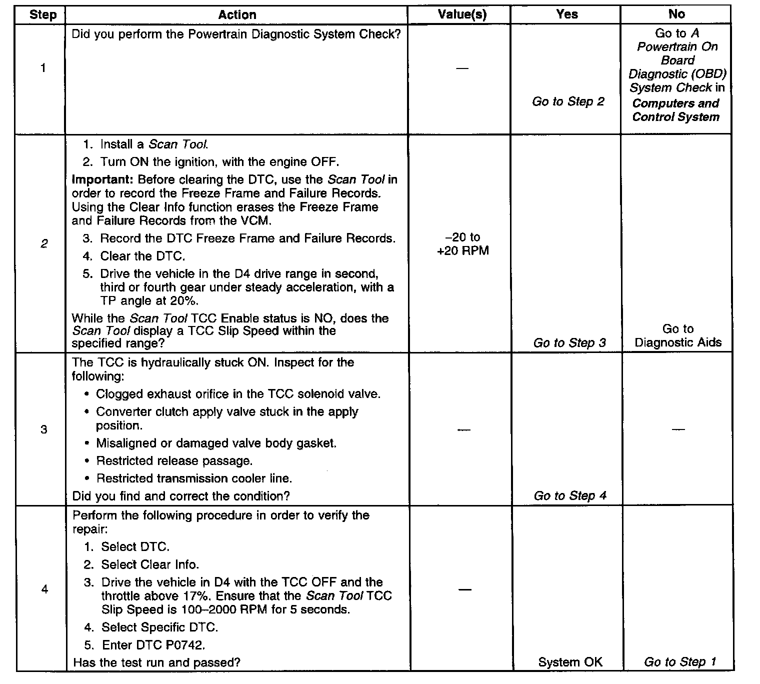 When the VCM detects low torque converter slip when the TCC is commanded OFF, then DTC P0742 sets. DTC P0742 is a type B DTC.