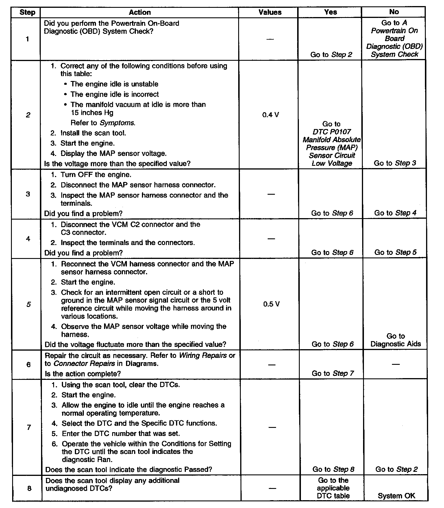 2. If the MAP sensor voltage is more 0.4 volts, the condition is present. Even though DTC P0107 did not set, this DTC is more comprehensive and may aid in diagnosis.
