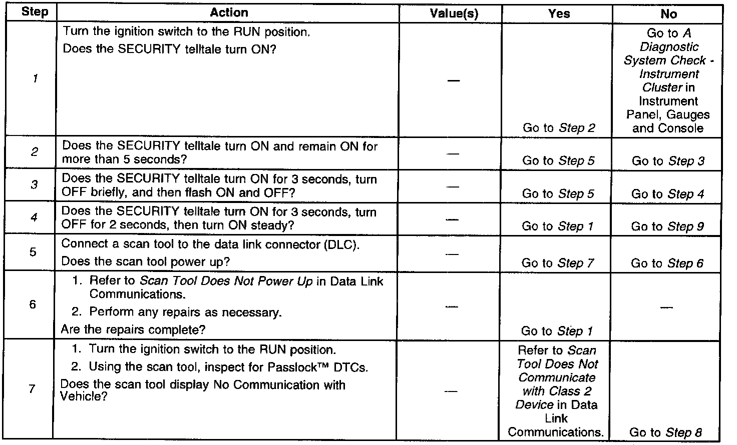 8. This operation of the SECURITY telltale indicates that Passlock(TM) DTCs exist. If the scan tool is operating properly and indicates that no Passlock(TM) DTCs exist, the BCM may be malfunctioning.