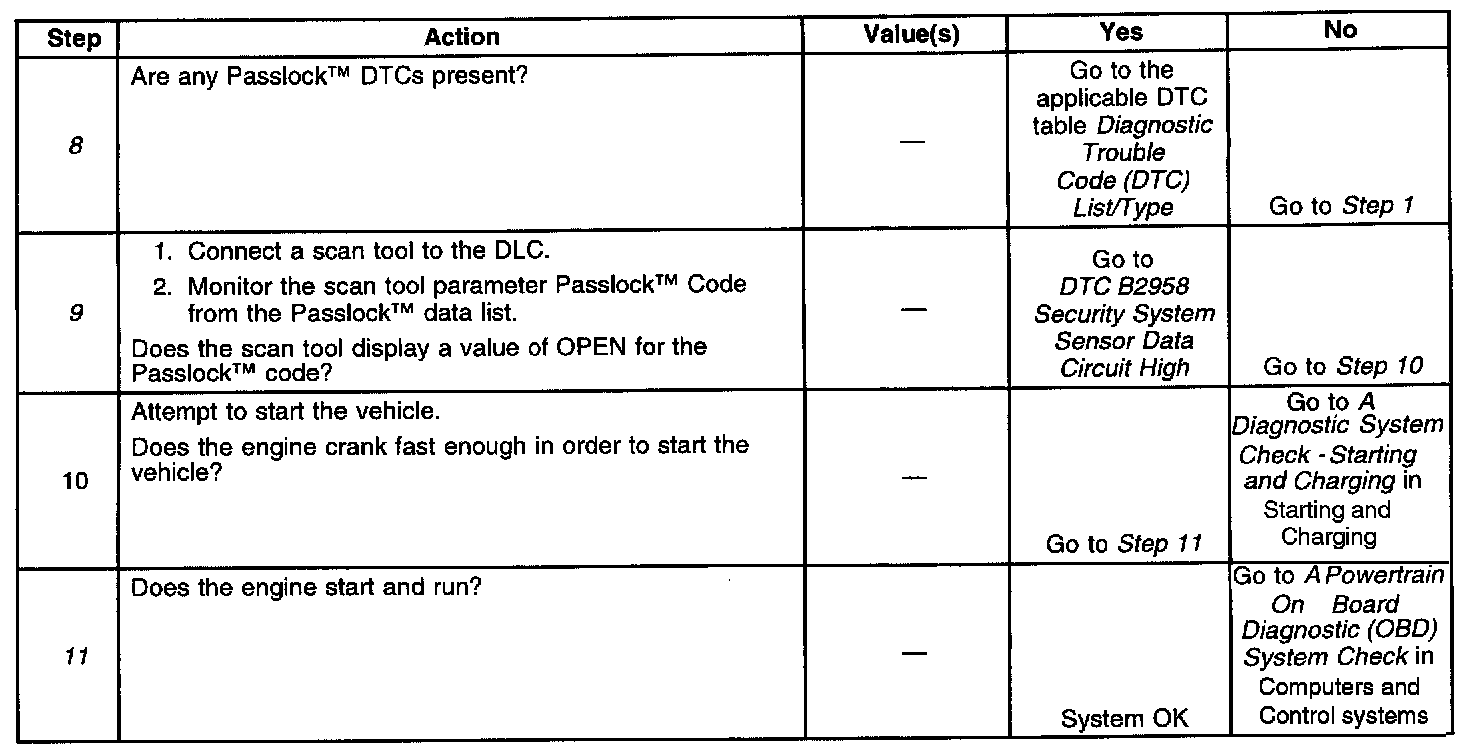 9. This condition indicates an open in the Passlock(TM) sensor circuits. If the powertrain parameter VTD Fuel Disable displays ACTIVE during or immediately following cranking, the sensor circuits are also open. This condition is tested in the DTC B2958 diagnostic table. Refer to DTC B2958 Security System Sensor Data Circuit High.