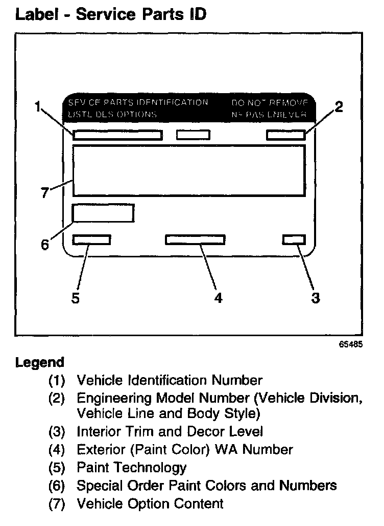 The Service Parts Identification Label aids the service personnel in identifying the parts and options originally installed on the vehicle. The label is located on the front passenger door frame.