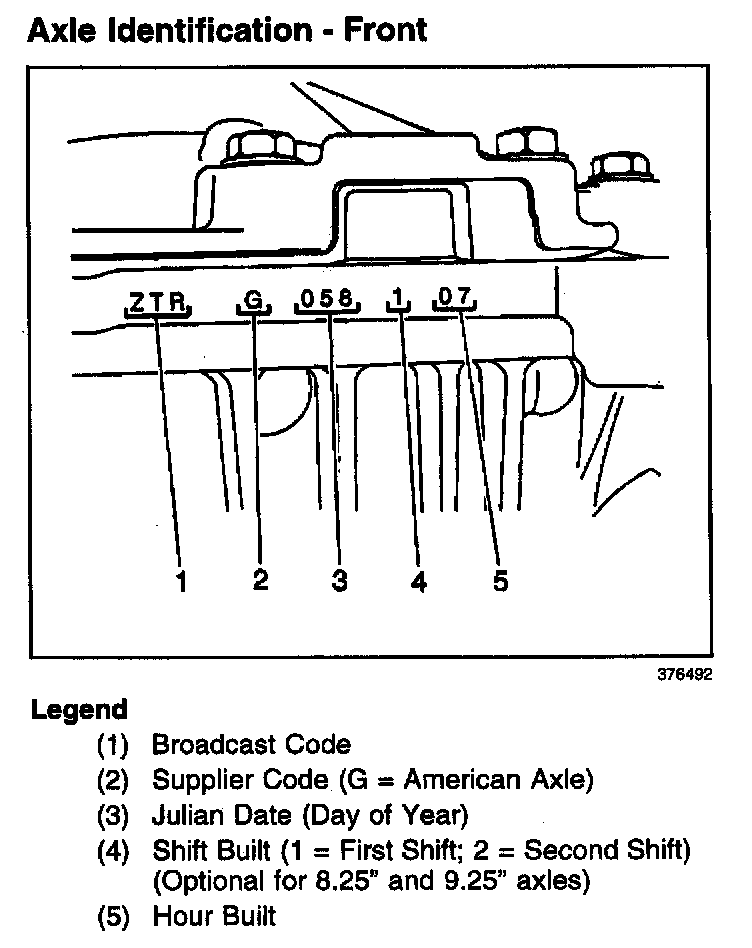 Front axle identification information is stamped on the top of the differential carrier assembly.