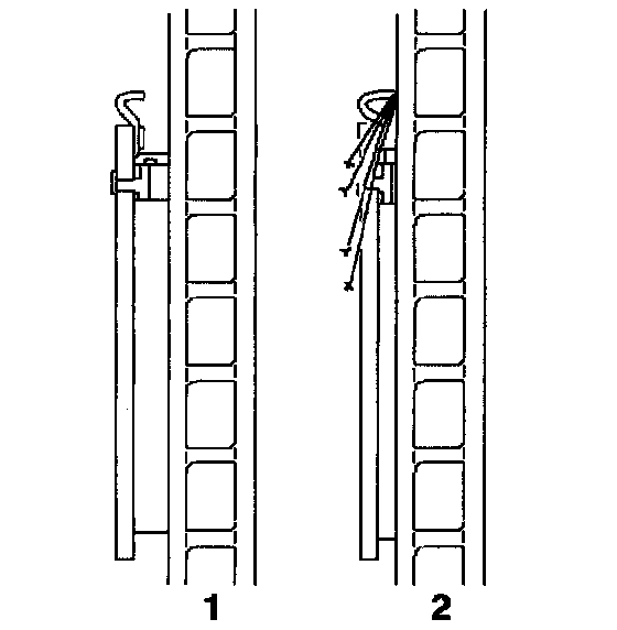 The outboard shoe and lining assembly has a wear indicator (1) that contacts the rotor when the lining needs replacement (2) and the brakes are applied. This produces a loud scraping noise.