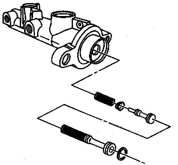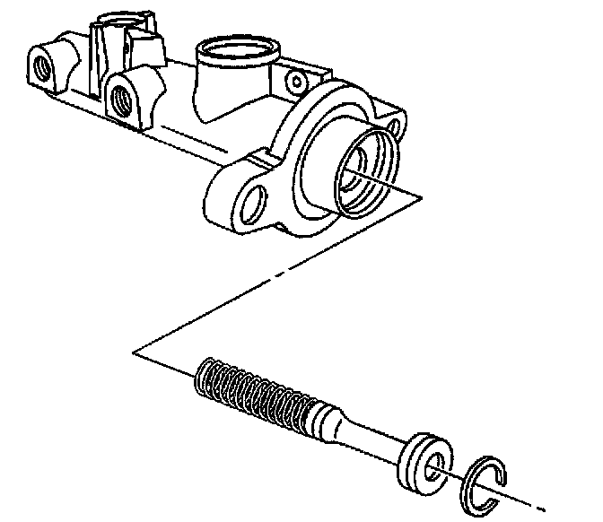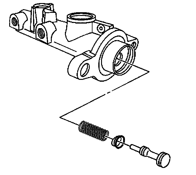 Disassembly ProcedureNotice: Do not hone the master cylinder bore. When the brake master cylinder is overhauled, it is recommended that the cylinder body be replaced rather than CLEANED UP by honing the bore. The master cylinder has a hard, highly polished BEARINGIZED surface, which is produced by diamond boring followed by ball or roller burnishing under heavy pressure. Honing will destroy this hard smooth surface and cause rapid wear of the rubber cups.