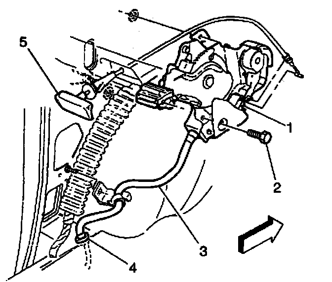 7. Disconnect the park brake cable (3) from the lever (1). The locating tab on the lever must be straightened to release the cable.