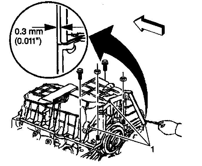 Use a feeler gauge to check the clearance between the oil pan-to-transmission housing measurement points. If the clearance exceeds 0.3 mm (0.011 inch) at any of the 3 oil pan-to-transmission housing measurement points (1), then repeat the step until the oil pan-to-transmission housing clearance is within the specification. The oil pan must always be forward of the rear face of the engine block.
