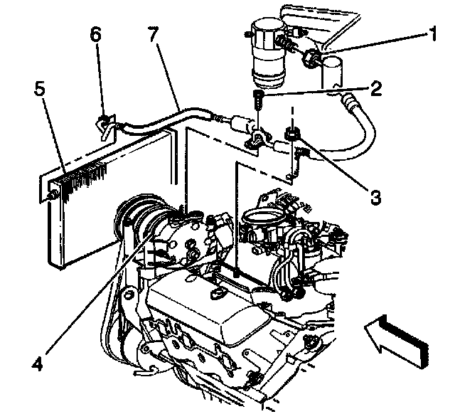 14. Remove the compressor and condenser hose nut (6) from the condenser.