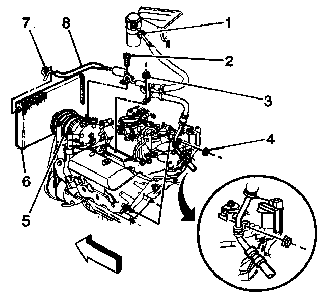 8. Remove the nut that attaches the compressor and condenser hose bracket to the engine.