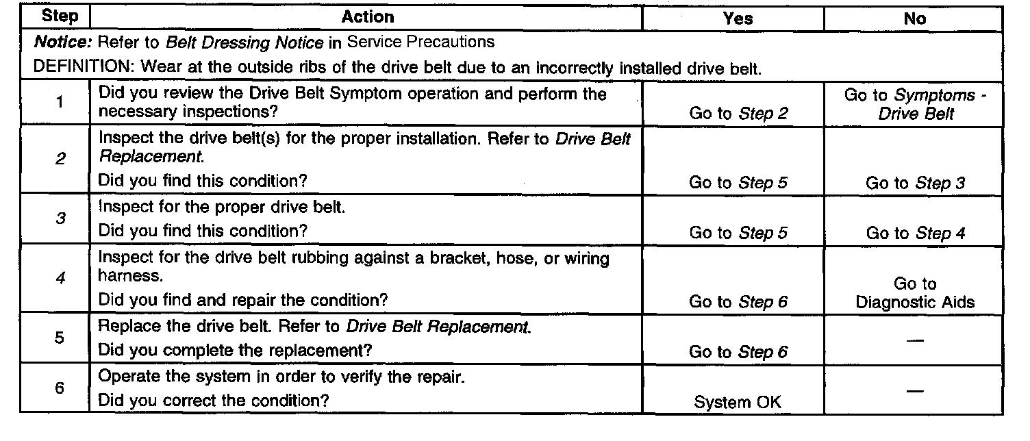 2. The inspection is to verify the drive belt(s) is correctly installed on all of the drive belt pulleys. Wear on the drive belt(s) may be caused by mis-positioning the drive belt(s) by one groove on a pulley.