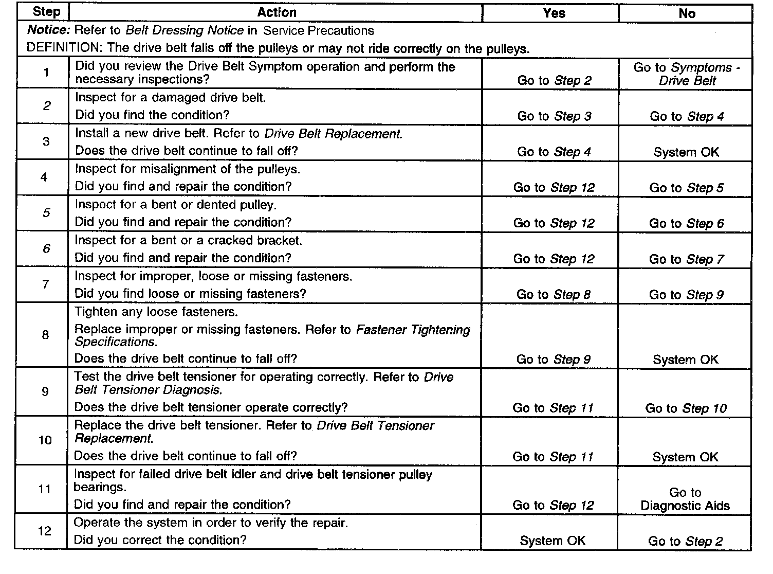 An extra load that is quickly applied on released by an accessory drive component may cause the drive belt to fall off the pulleys. Verify the accessory drive components operate properly.
