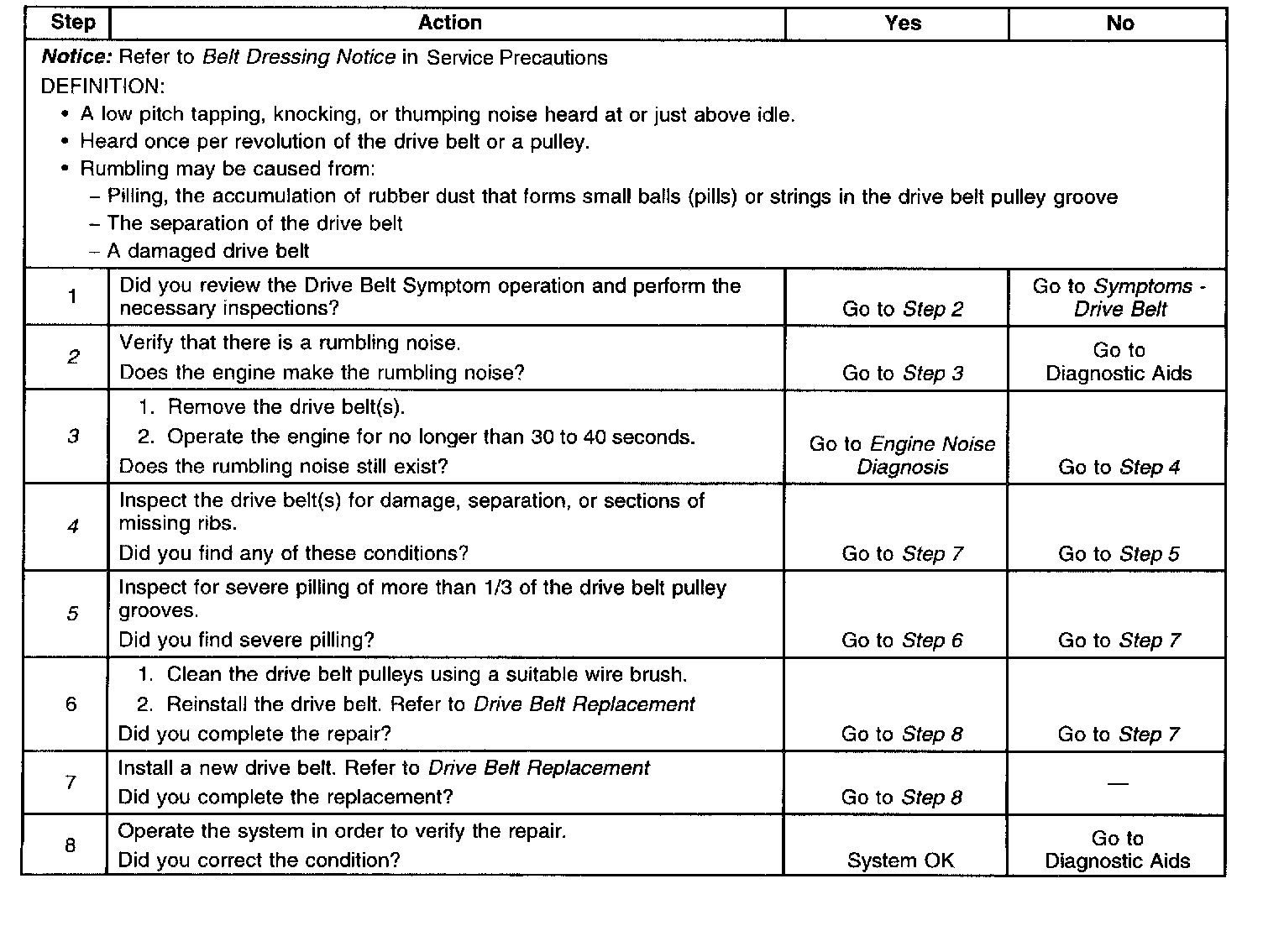 3. This test is to verify that the drive belt(s) is causing the rumbling noise. Rumbling noise may be confused with an internal engine noise due to the similarity in the description. Remove only one drive belt at a time if the vehicle has multiple drive belts. When removing the drive belt the water pump may not be operating and the engine may overheat. Also DTCs may set when the engine is operating with the drive belt removed.