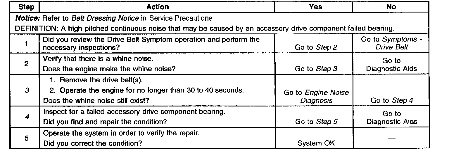 4. The inspection should include checking the drive belt tensioner and the drive belt idler pulley bearings. The drive belt(s) may have to be installed and the accessory drive components operated separately by varying their loads. Refer to the suspected accessory drive component for the proper inspection and replacement procedure.