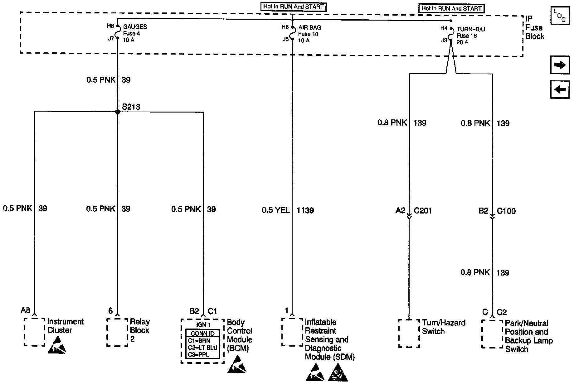Power Distribution Schematics: GAUGES Fuse 4, AIR BAG Fuse 10 and TURN-B/U Fuse 16: