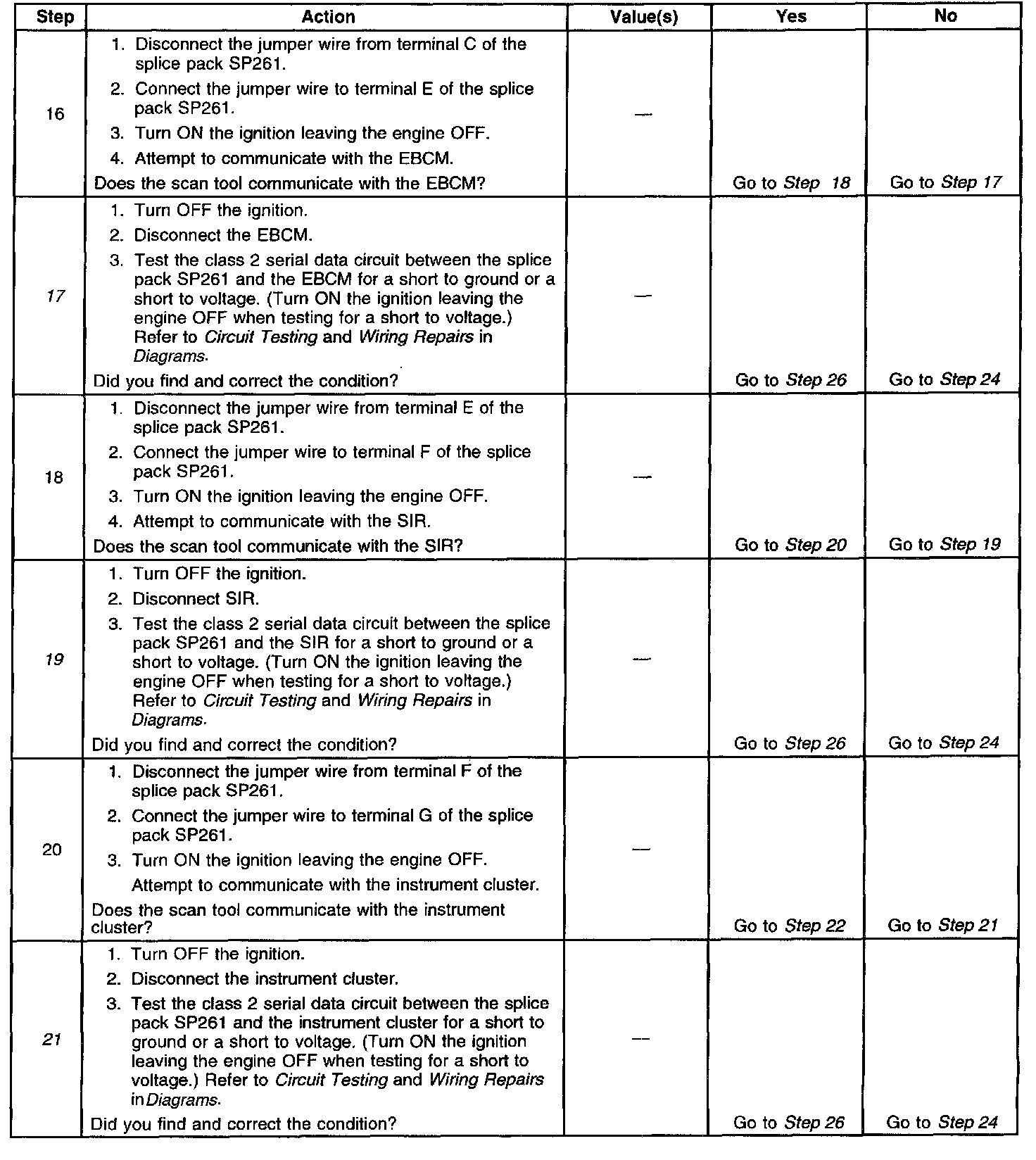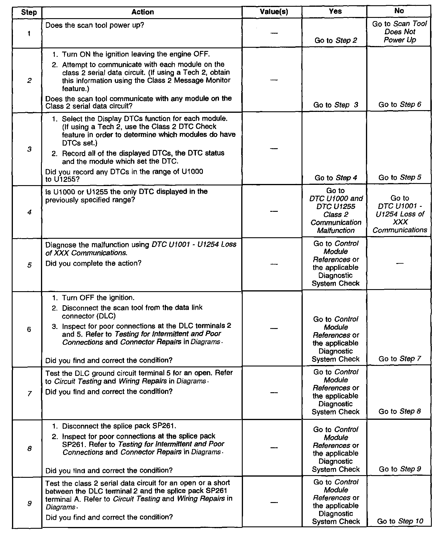 8. An open in the class 2 serial data circuit between the DLC and splice pack SP261 will prevent the scan tool from communicating with and module. This condition will not set a DTC.