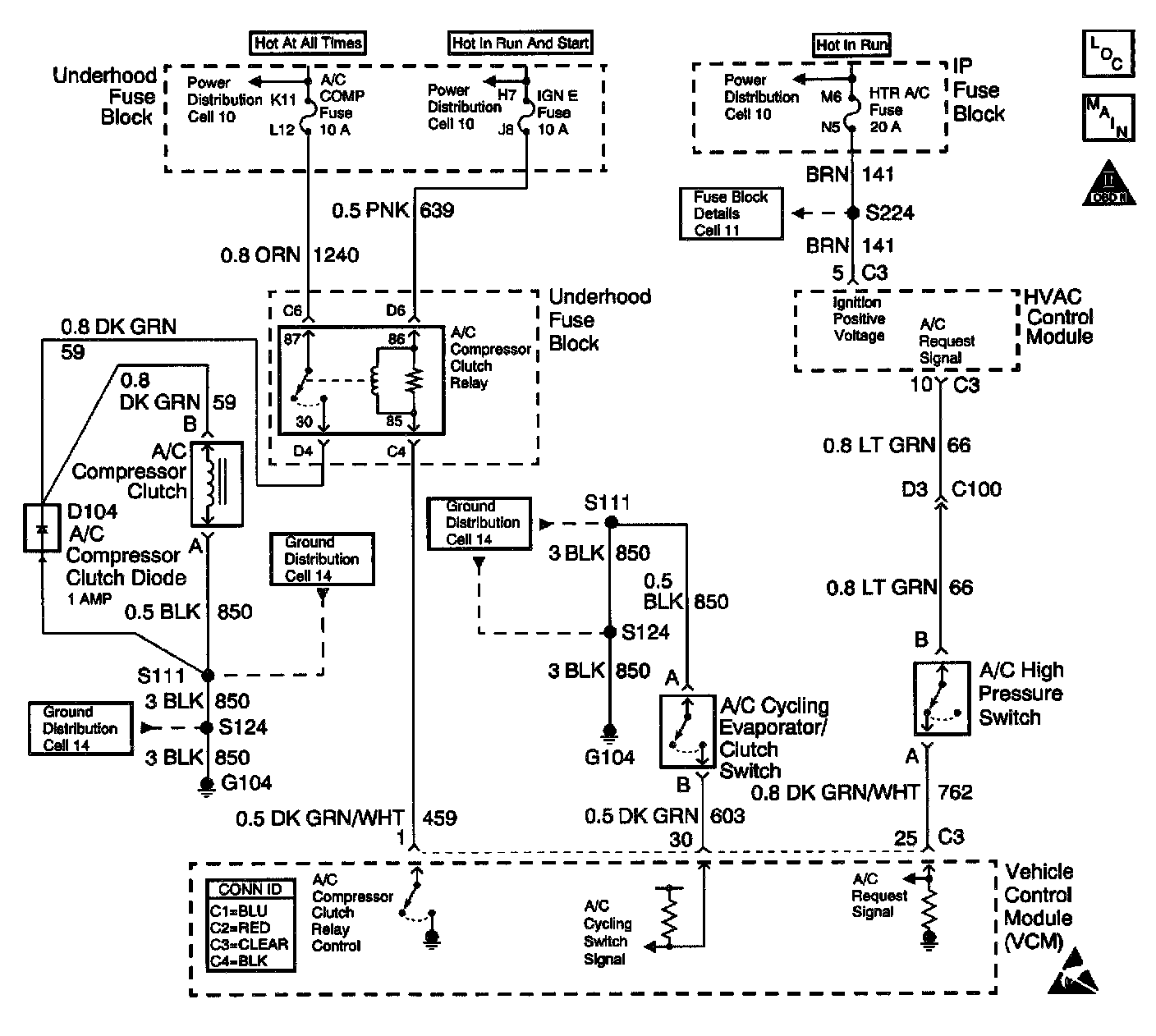 19. The A/C request signal circuit consists of the HVAC control module, the A/C high pressure cutout switch, and the related wiring.