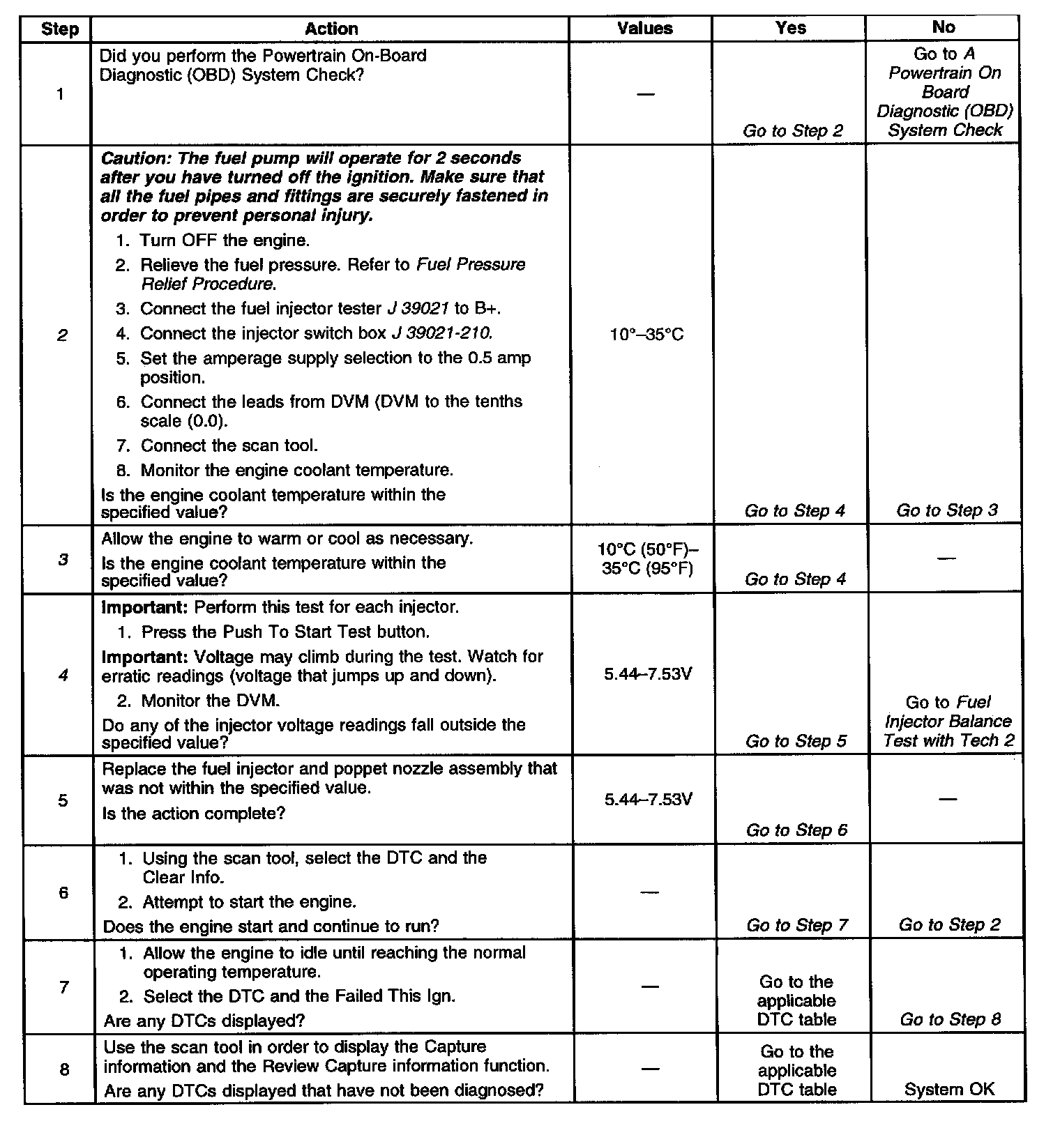 4. Due to a current surge, the first second of the voltage reading may be inaccurate; therefore, begin recording after the first second of the voltage reading. The voltage specification should be within range. The voltage reading may increase throughout the test as the injector windings warm up and the resistance changes. An erratic voltage reading (one that jumps up and down) would indicate an intermittent connection within the fuel injector.