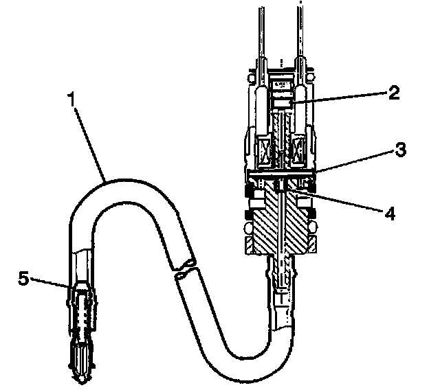 Each fuel injector assembly is a solenoid-operated device, controlled by the control module. The fuel injector assembly meters the pressurized fuel through a poppet nozzle valve (5) to a single engine cylinder. The control module energizes the flow control solenoid (2), which opens an armature valve (3), allowing fuel to flow past the valve and through a flexible fuel pipe (1) to the poppet nozzle valve. An increase in fuel pressure causes the poppet nozzle ball to open from its seat against the extension spring force. This allows the fuel to flow from the nozzle.