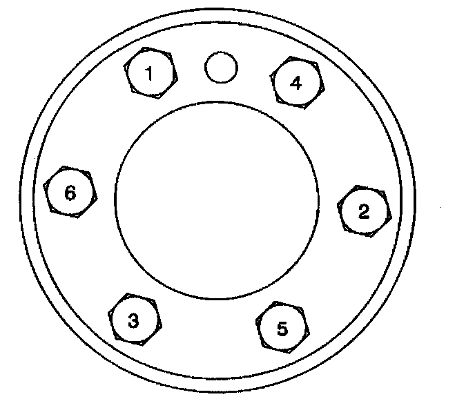 Tighten the engine flywheel bolts in sequence (1-6) to