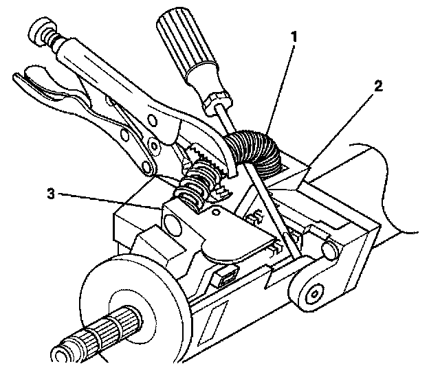 3.2. Secure the tilt spring with locking pliers and continue prying until the tilt spring disengages from the post of the steering column support assembly (3).
