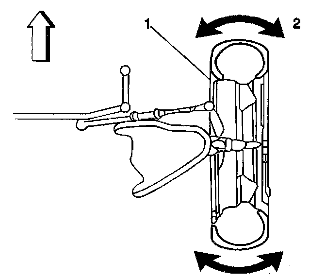 5. Move the wheel back and forth (2) without moving the steering wheel. The gauge reading should not exceed 2.74 mm (0.108 inch).