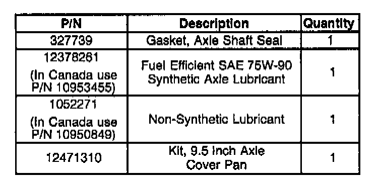 On vehicles built after mid-February 1998 and equipped with 9.5 inch rear axles, synthetic lubricant, P/N 12378261, can be used because the RTV was replaced with a gasket. Other mid-February changes to the 9.5 inch rear axles include a new cover pan and cover pan fasteners common to other axles.
