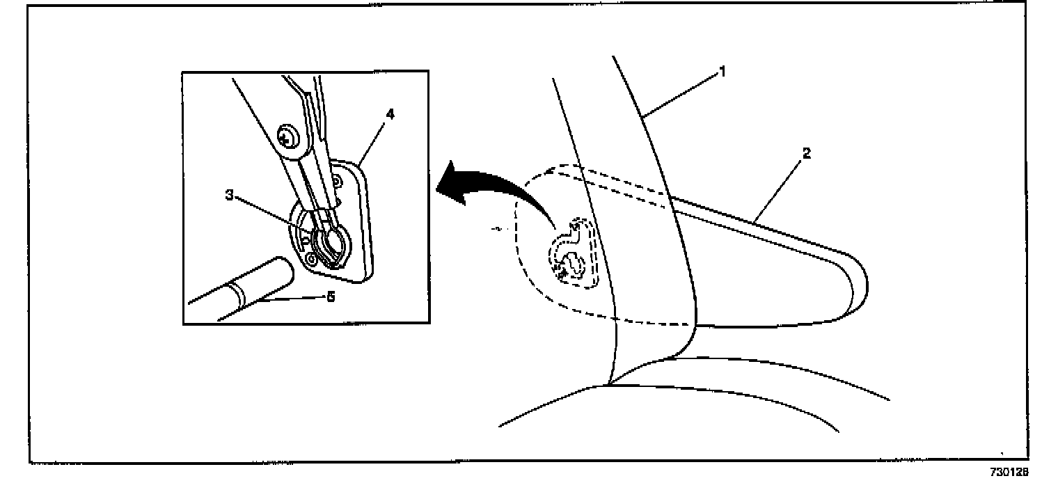 2. Place a pair of internal snap-ring pliers between the seat back (1) and the armrest (2). Make sure that the snap-ring pliers go between the finger detents (3) of the torque washer (4).