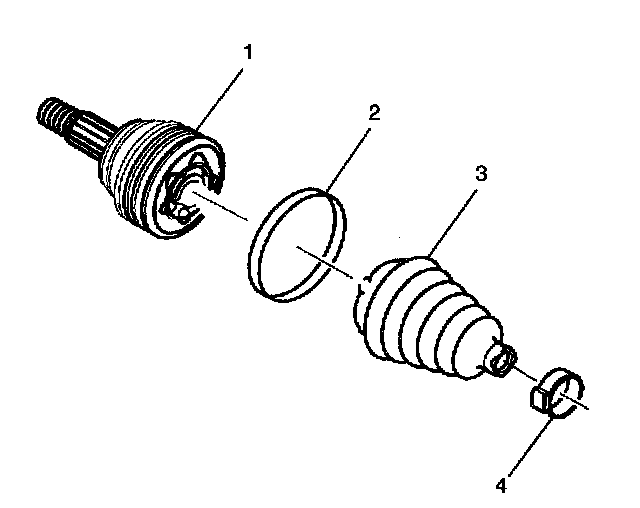 4. Slide the boot down the halfshaft bar (4) and away from the CV joint outer race (1). Wipe all of the grease away from the face of the CV joint.