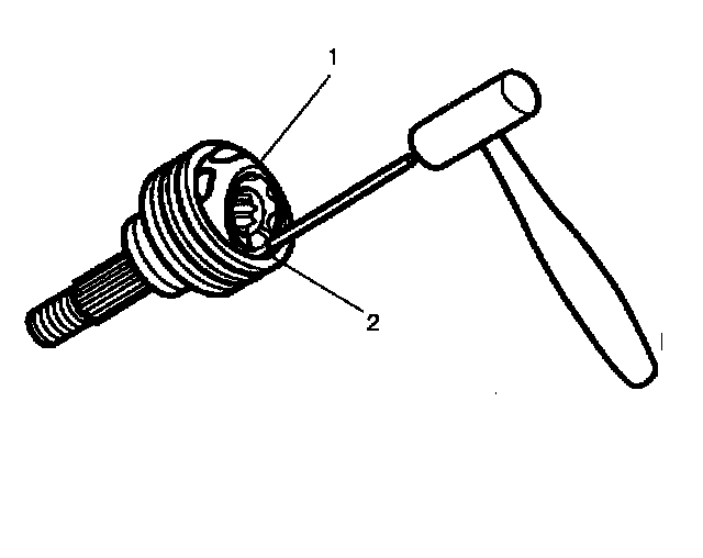 19. Slide the CV joint (2) onto the halfshaft bar (1). The retaining snap ring that is inside of the inner race engages in the halfshaft bar groove with a click when the CV joint is in the proper position.