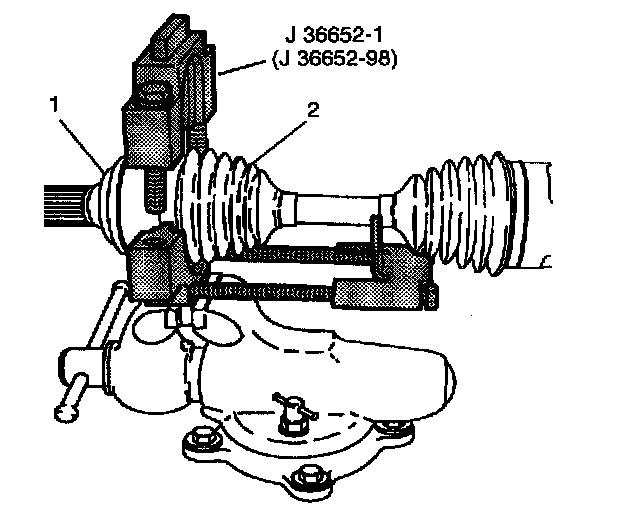 23. Position the CV joint end (outboard end) (1) of the halfshaft bar assembly in the bottom half of J 36652