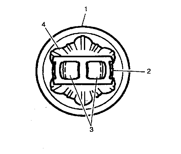 12. Pivot the CV joint cage (4) and the inner race 90 degrees to the centerline of the outer race (1). At the same time, align the cage windows (3) with the lands of the outer race (2).