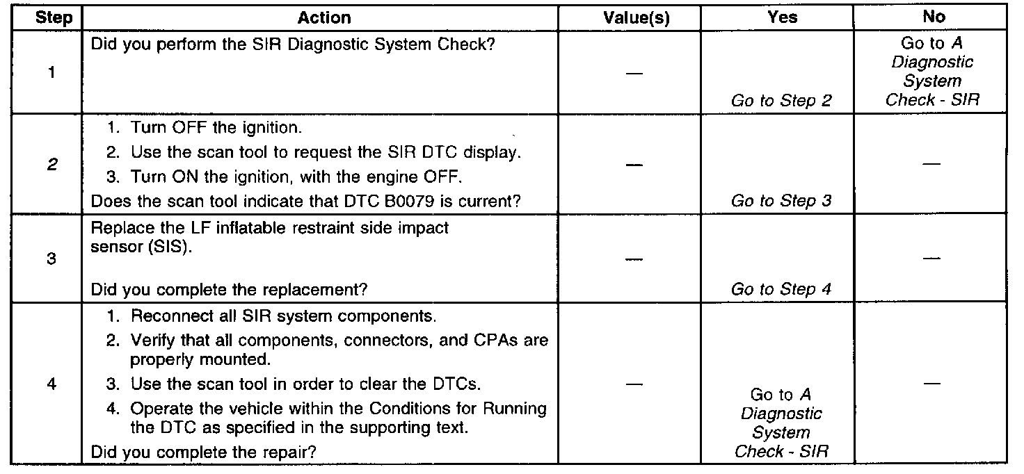 When you first turn the ignition switch to the RUN position, the inflatable restraint Sensing and Diagnostic Module (SDM) performs tests to diagnose critical malfunctions within itself. The SDM provides input power to the inflatable restraint Side Impact Sensor (SIS). When input power is first detected, the SIS responds by performing internal diagnostics. The SIS then sends an ID message to the SDM. The SDM will consider this to be a valid ID if the response time is less than 5 seconds after the SIS is powered up.The SIS will continually communicate a status message to the SDM. The SDM can reset the SIS by removing and applying power to it.