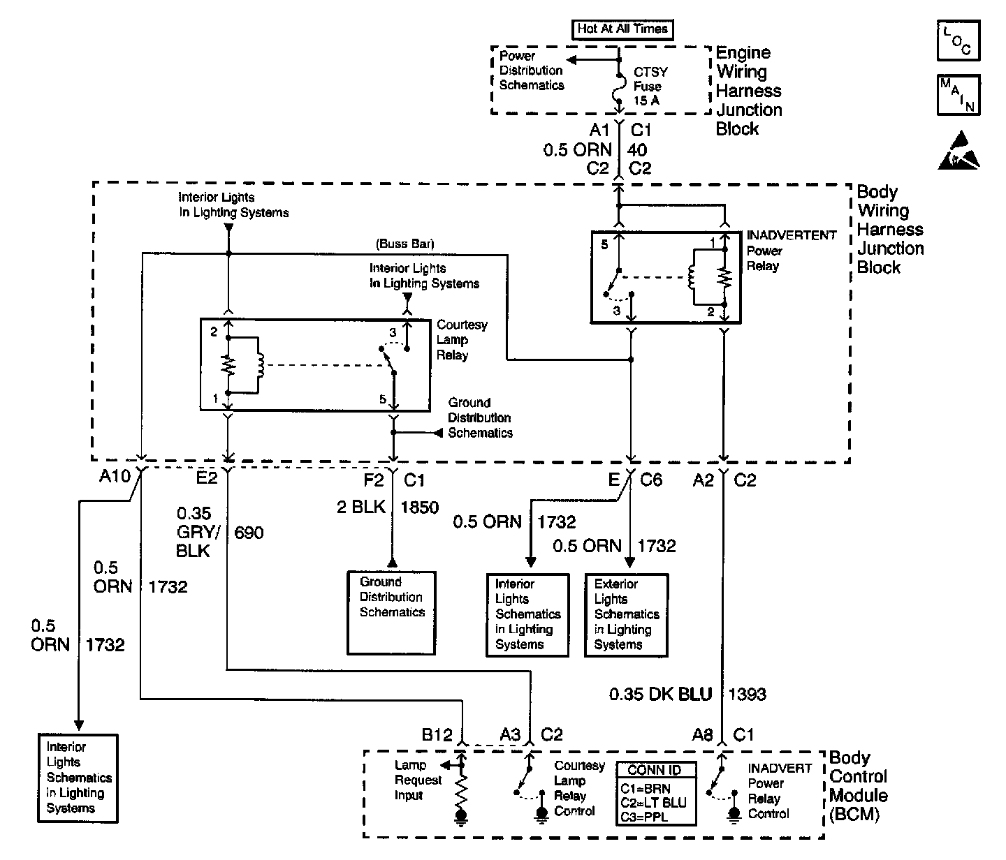 ^ When the BCM commands the inadvertent power relay ON via CKT 1393 and CKT 1732 has an absence of voltage at the BCM, DTC B1480 will set.