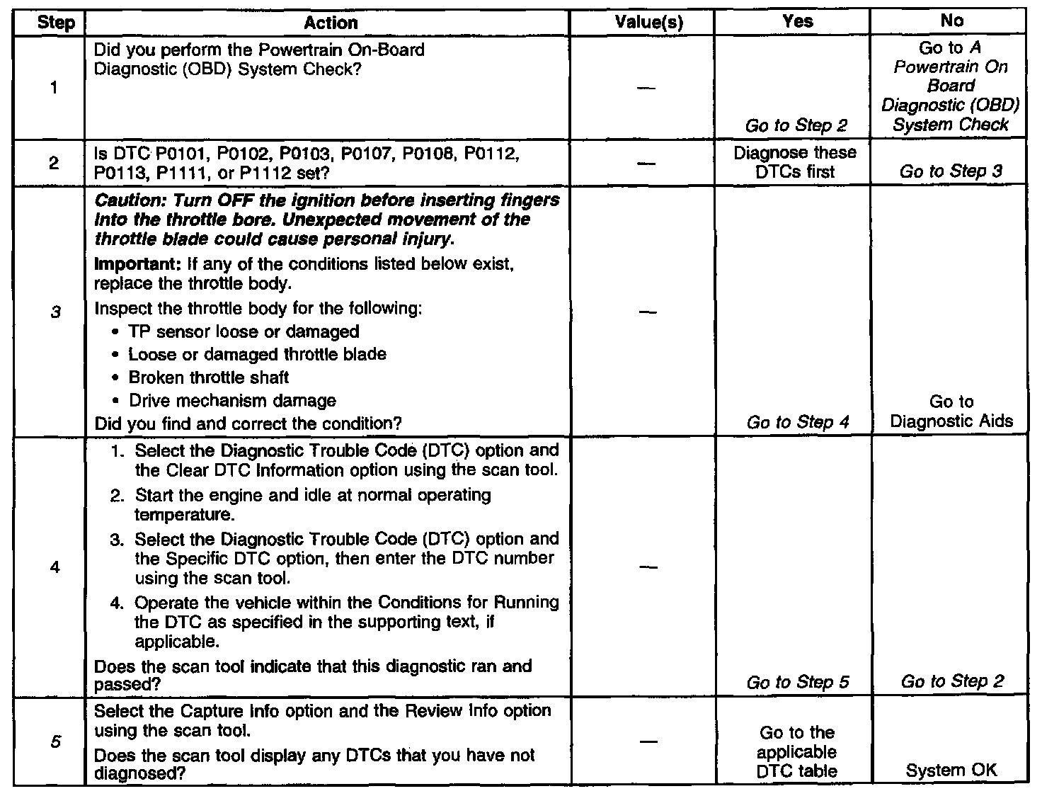 3. Physically/visually inspect the throttle body assembly and correct any problems that you observe. Manually move the throttle blade from closed to Wide Open Throttle (WOT). You should not need to use excessive force. The throttle blade should move smoothly through the full range and should return to a slightly open position on its own.