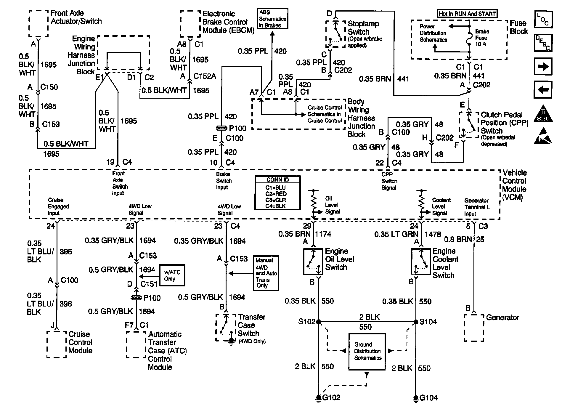 Engine Controls Schematics: EBCM, Oil Level Switch, ATC Module, Coolant Level Switch, G102, G104: