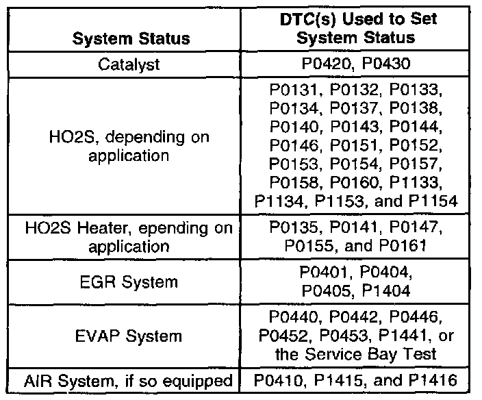 Using a scan tool, the technician can observe the System Status (Complete or Not Complete) in order to verify that the vehicle meets the criteria which complies with the local area requirements. Using the System Status display, monitor any of the following systems or a combination of the systems, depending on vehicle make and model, for I/M Readiness: