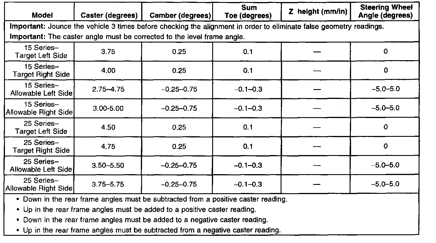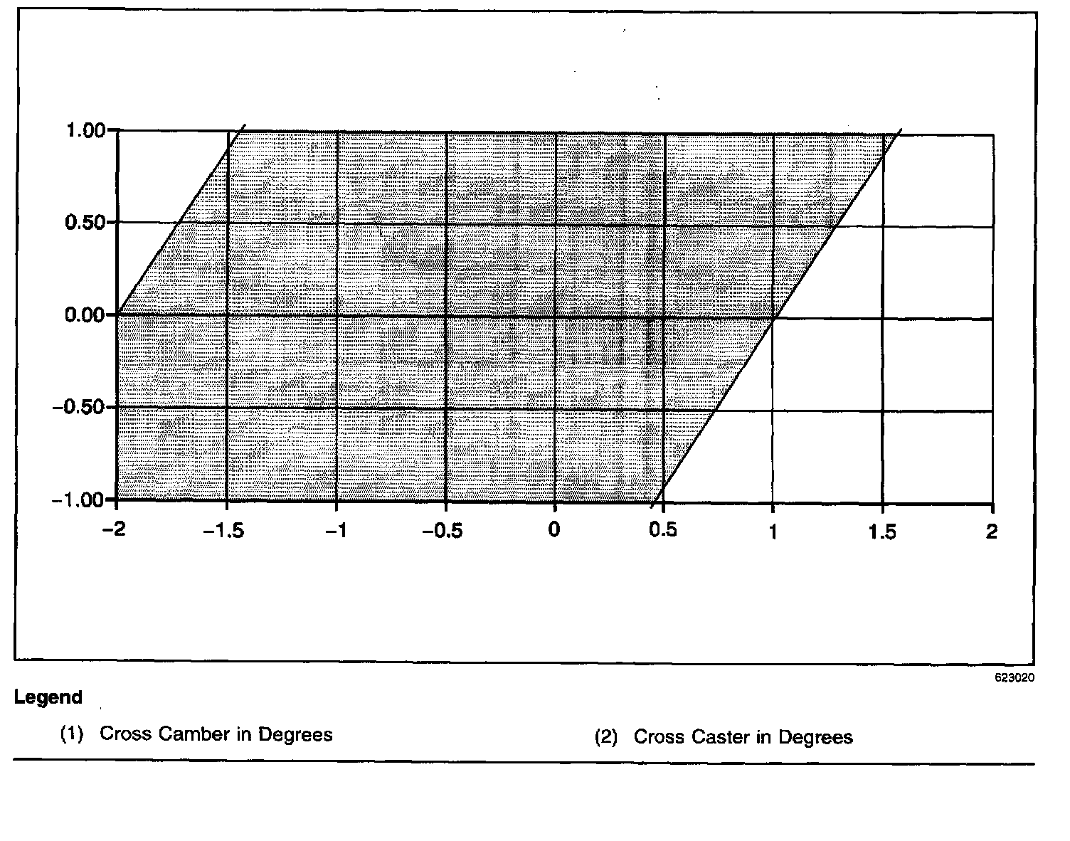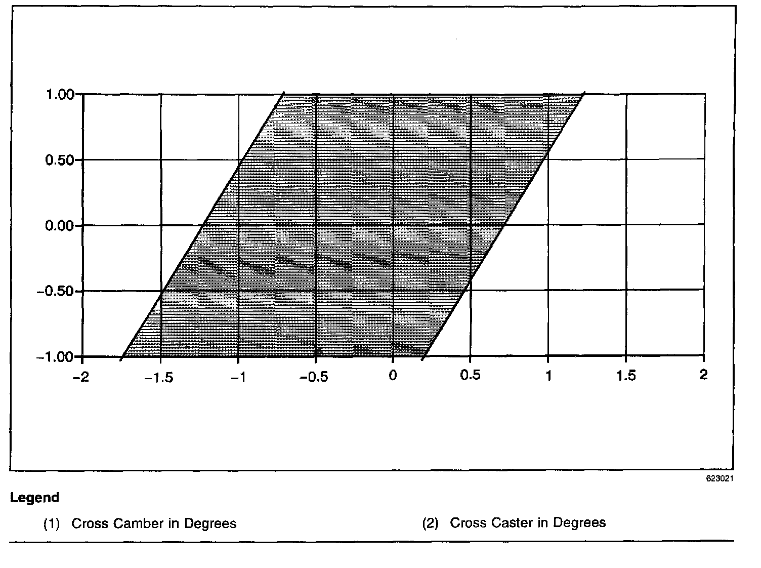 Use the cross camber and cross caster figures from your alignment equipment and compare them with the following charts. The shaded areas are within the allowable specification for steering wheel pull.