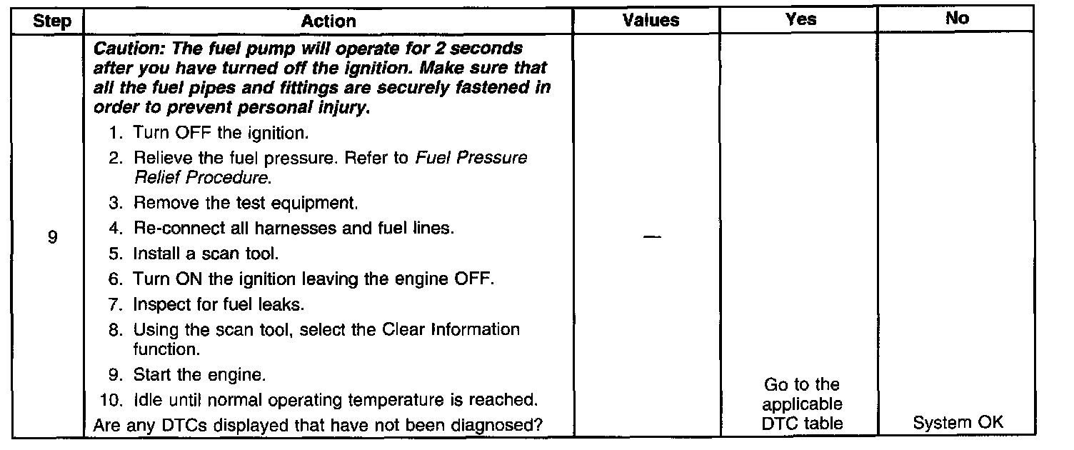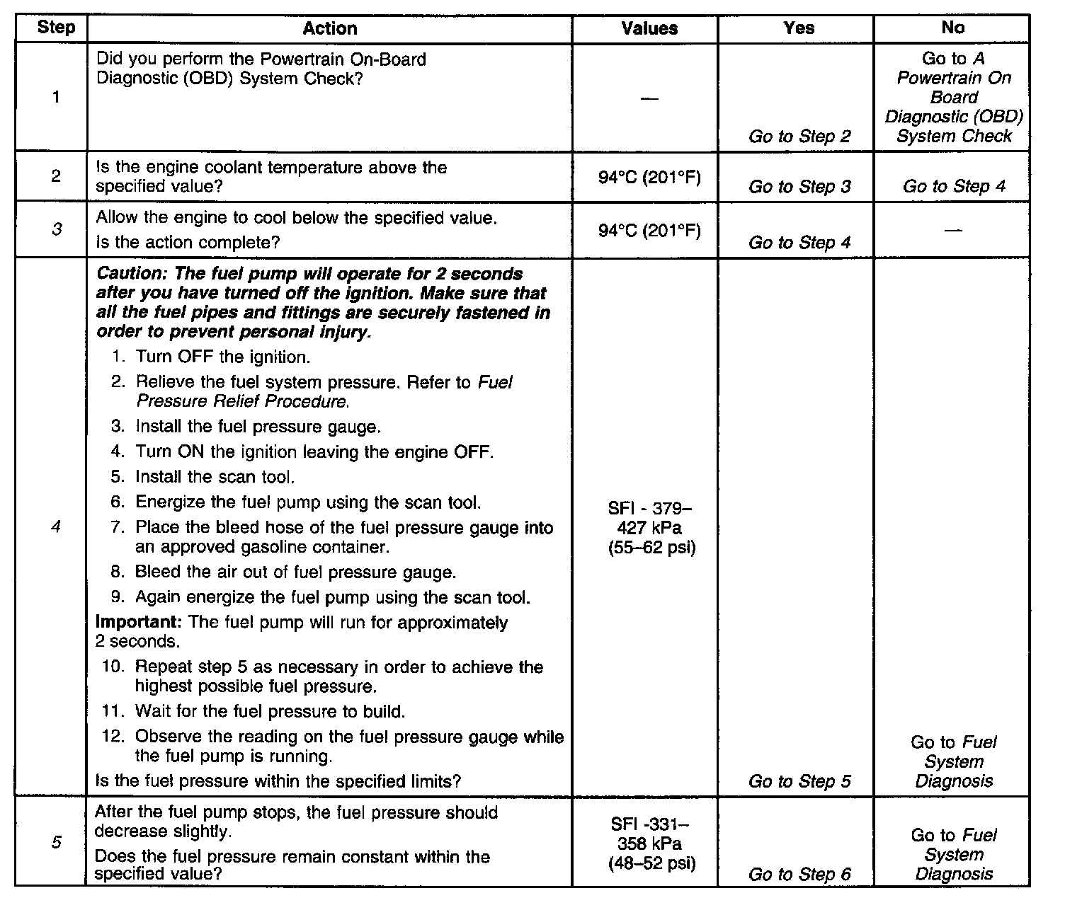 4. The fuel pressure should be within the specified range with the fuel pump running. If the fuel pressure is not within the specified range, refer to Fuel System Diagnosis. Component Tests and General Diagnostics