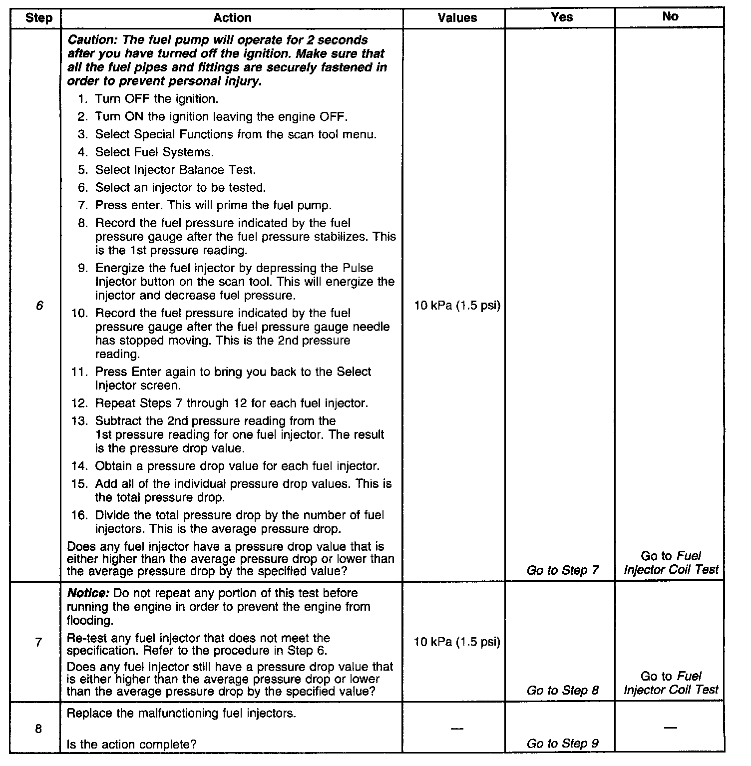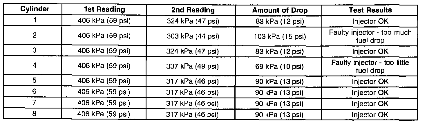 Test Results: Combine all of the injector pressure drops and divide this number by the amount of injectors available. This is the average pressure drop. Each individual injectors pressure drop value must be within 10 kPa (1.5 psi) of the average pressure drop value.