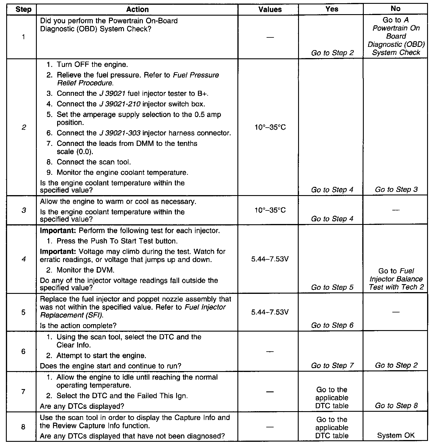 4. Due to a current surge, the first second of the voltage reading may be inaccurate, therefore, begin recording after the first second of the voltage reading. The voltage specification should be within range. The voltage reading may increase throughout the test as the injector windings warm up and the resistance changes. An erratic voltage reading, one that jumps up and down, would indicate an intermittent connection within the fuel injector.