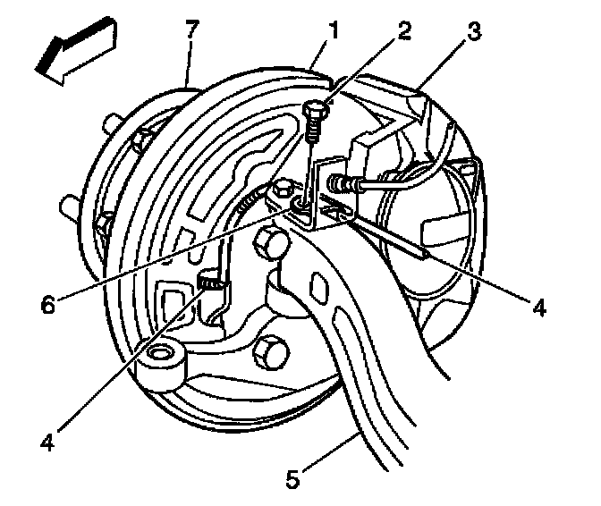 19. Take care to route the wheel speed sensor wire (4) through the opening in the splash shield (1) near the center mounting hole.