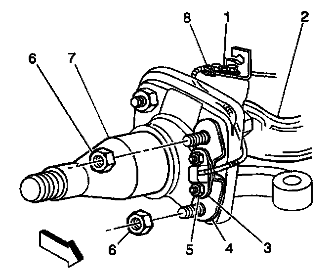 5. Remove the wheel speed sensor wire mounting clip (6) attached to the upper king pin cap.