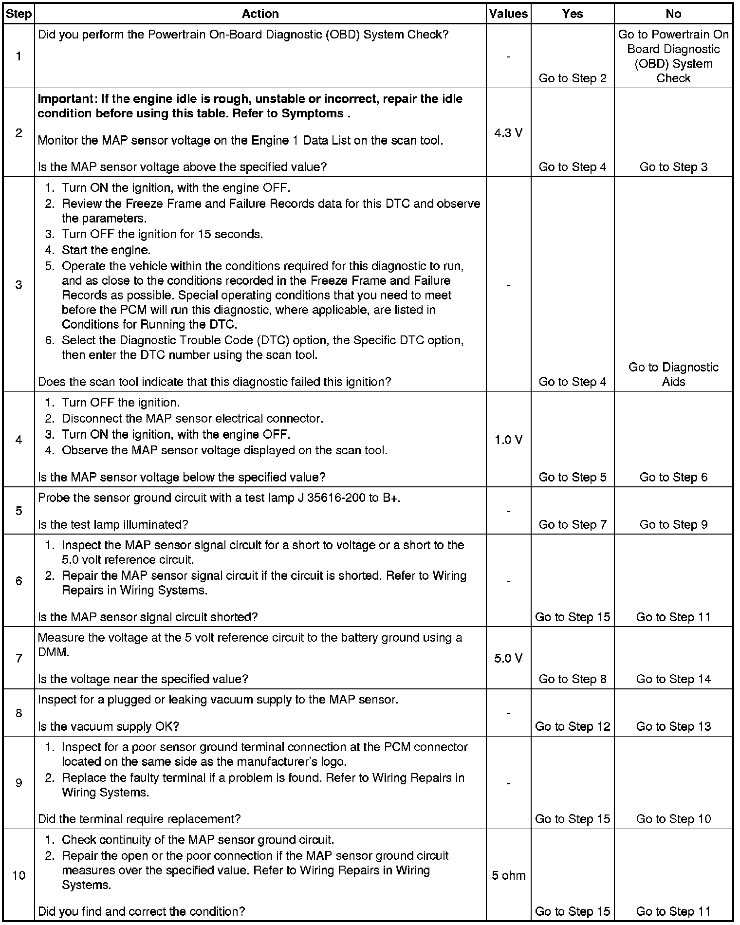 The manifold absolute pressure (MAP) sensor is mounted in front of the intake manifold. The MAP sensor measures pressure changes within the intake manifold, which is an indication of engine load. The MAP sensor has a 5.0 volt reference, a ground and a signal circuit. The MAP sensor contains diaphragm which changes resistance based on pressure. When manifold pressure is low (high vacuum) sensor output voltage is low. When manifold pressure is high (low vacuum) sensor output voltage is high. MAP sensor voltage (depending on altitude) can range from 1.0-1.5 volts at idle (high vacuum) to 4.0-4.9 volts at wide open throttle (low vacuum). When the PCM senses a signal voltage higher than the normal operating range of the sensor.