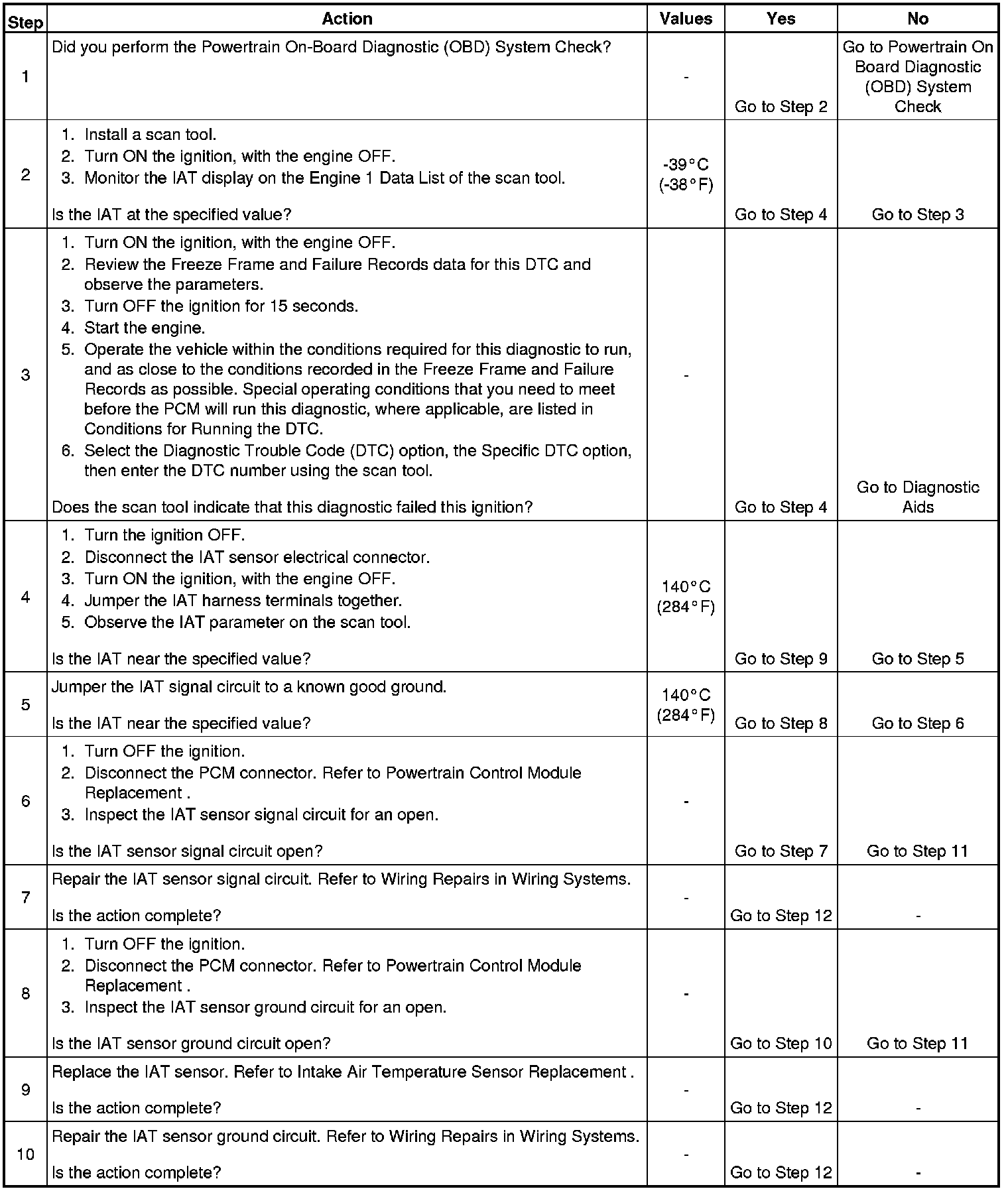 A scan tool indicates the temperature of the ambient air which is entering the throttle body. The air temperature should read very close to the temperature of the outside air. The air temperature should rise gradually as the engine warms up and the underhood temperature increases. If DTC P1111 is set, the problem is intermittent. Check for an open in the IAT sensor circuit. This may be accomplished by moving the PCM harness at various locations and monitoring IAT temperature or IAT voltage on the scan tool. If the voltage varies, look for an open in the area of the harness that caused the variance Also, a sensor may become skewed or mis-scaled. The Temperature vs. Resistance Value Table will help in order to detect a skewed sensor. Refer to Temperature Versus Resistance [1][2]Computers and Control Systems.